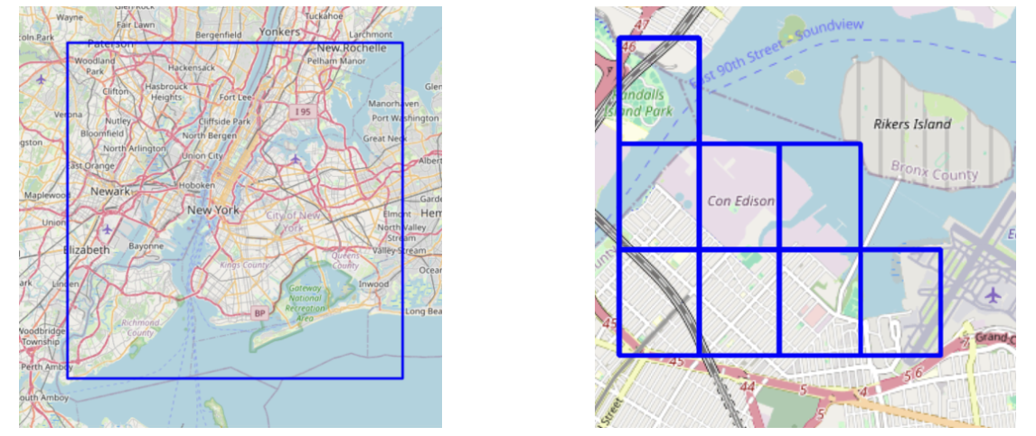 To facilitate the analysis and processing of taxi trip data, the geographic location information was first converted into a grid-based representation. Specifically, latitude–longitude coordinates were transformed into grid indices, with each grid cell measuring 0.01 degrees in both latitude and longitude. This approach converts continuous geographic coordinates into discrete spatial data, making them easier to process and analyze. By mapping the pick-up and drop-off coordinates to grid indices, it becomes possible to efficiently compute the number of taxi trips and trip characteristics within each grid cell, thereby laying the foundation for the development of the subsequent demand forecasting model. A local view of the gridding result is shown in Figure 2.