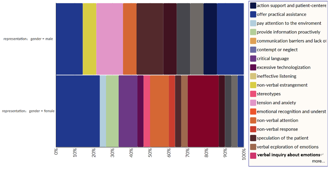 Regarding emotional response and connection, female nursing students were better at establishing emotional connections through diverse means such as verbal comfort and nonverbal caring behaviors, with a significant advantage particularly in nonverbal caring expressions and emotional synchrony. In emotion recognition and understanding, males and females showed minimal differences in basic abilities, including nonverbal attention at the perceptual level and understanding emotional roots at the cognitive level. In communication barriers and empathy deficits, male nursing students exhibited a relatively higher incidence of issues such as excessive technicality and ineffective listening, reflecting gender-differentiated characteristics in empathy expression and practice (see Figure 1).