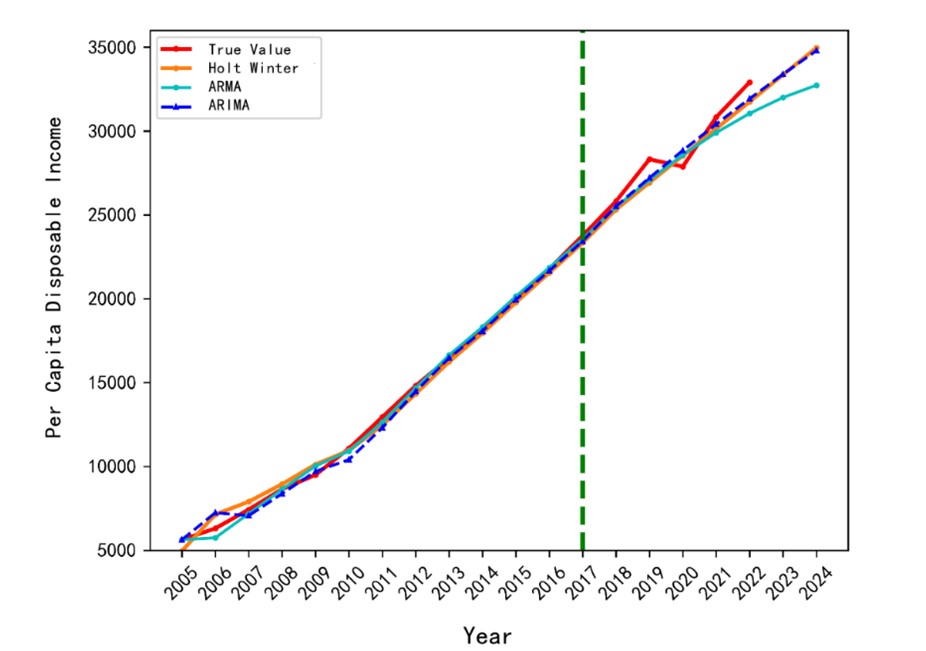 To anticipate the fluctuations in per capita disposable income among Hubei Province inhabitants for the subsequent biennium, a dataset spanning from 2005 to 2022 was culled. Employed in this study were three distinct time series prognostication methodologies: Exponential Smoothing (Holt-Winter), Autoregressive Moving Average (ARMA), and Autoregressive Integrated Moving Average (ARIMA). These techniques were applied to envision the forthcoming trajectory of per capita disposable income for the province's residents. By computing diverse metrics to assess predictive discrepancies—like the Mean Absolute Error (MAE) and Root Mean Square Error (RMSE)—the effectiveness of the assorted models was gauged, culminating in the selection of the ARIMA model due to its superior performance. Capitalizing on this, approximations for per capita disposable income during 2023 and 2024 were extrapolated. The resultant prognoses project a sustained and noteworthy uptick in per capita disposable income for urban denizens of Hubei Province in the forthcoming biennial span. Ultimately, the findings were translated into actionable policy suggestions and deductions, rendering them highly pertinent for the dissection of Hubei Province's economic evolution.