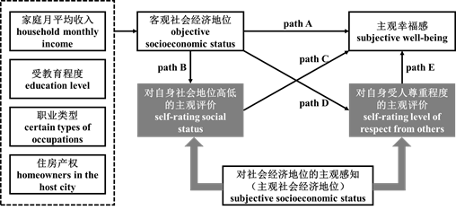 Promoting subject well-being of migrants could give full play to the advantages of talent's resource. Social position and social inclusion of migrants could be the key to pursue a people-centered, new type of urbanization and bring about rural migrants’ settling in cities. There is a lack of studies focusing on social comparison and social inclusion of migrants with the point of geographical features. Using the data collected from China Migrants Dynamic Survey in 2014, the relations among object socioeconomic status and self-rating social status as well as subject well-being of migrants in one municipal district and seven prefecture-level cities of China was examined by adopting multilevel linear regression model, which includes both mediating variables and moderating variables. Several conclusions are drawn as follows: 1) Migrants’ subjective well-being is affected by their objective socioeconomic status. Whilst migrants’ comparing themselves with local relatives and colleagues, as we call it self-rating social status, plays a part in mediating relations between object socioeconomic status and subject well-being, especially when the object socioeconomic status refers to migrants’ household monthly income, certain types of occupations (including civil servants, clerks and the self-rated) and homeowners in the host city. 2) When compared their socioeconomic status with locals in the host cities, including economic status and respect for themselves, the deeper the migrants are merging into cities and social networks, the weaker the relationship between self-rating social status and subjective well-being will be. In other words, social inclusion among migrants do negatively regulates the relations above. 3) However, there is no evidence that the higher the acceptance degree of local residents in host cities to migrants, the deeper the impact of the respect for migrants on subjective well-being will be. Obviously, the acceptance degree of local residents could not significantly moderate the relations between respect for migrants and their subject well-being. Based on the above research conclusions, this paper suggests that for building a harmonious society and improving the quality of urbanization, equal treatment of migrants and locals should be identified and dealt with. Furthermore, Therefore, we must speed up migrants to blend into the society in the cities.