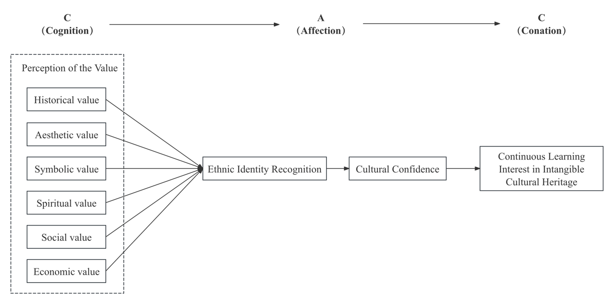 Using a sample of 605 elementary school students from grades 1 to 6 in two primary schools in Dalian, Liaoning Province, China, as the sample, this study explores the factors influencing students’ interest in continuing to learn Intangible Cultural Heritage (ICH) through school-based ICH activities. Grounded in the CAC theoretical model, the value theory of ICH, and ethnic identity theory, the research aims to provide fresh insights into the dissemination of ICH in schools and the development of children’s cultural education. The study categorises students’ perceived value of ICH activities into six dimensions: historical, aesthetic, symbolic, spiritual, economic, and social. It also examines a chained mediation effect composed of ethnic identity and cultural confidence. Using Structural Equation Modelling (SEM), the study empirically investigates the influencing factors and pathways. The findings reveal that all six dimensions of value significantly enhance students’ ethnic identity, which, in turn positively influences cultural confidence. Through this chained mediation effect, ethnic identity and cultural confidence play a crucial role in increasing students’ sustained interest in learning ICH.