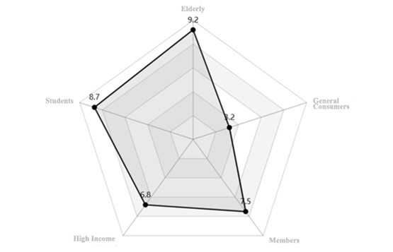 From the data distribution (as shown in Figure 4), the elderly group exhibits the highest price discrimination intensity, scoring 9.2, ranking first among all consumer groups. This phenomenon stems from the typically high price sensitivity among elderly consumers, whose purchasing behavior tends to reflect stable consumption frequency but lower per-transaction spending. By offering deep discounts, businesses can maintain loyalty among this group while compensating for reduced unit profits through economies of scale. The student group scores 8.7, slightly below the elderly but still within the high-intensity range. Student discounts are a globally adopted strategy. The economic rationale lies in fostering future consumption habits and securing market share among younger demographics. Students also exhibit strong social influence and word-of-mouth effects, which provide additional branding value for firms.