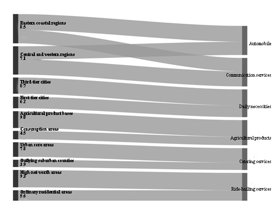 Geographical location has a significant and regionally differentiated impact on price discrimination. This variation is well demonstrated by the intensity of price discrimination across six major categories of consumer goods. The Sankey diagram clearly visualizes the flow of data, highlighting the strategic characteristics of differential pricing adopted by different regions for various product types. In eastern coastal regions, the automobile category exhibits the highest price discrimination intensity, reaching 8.5. This is attributed to the concentration of high-income consumers and the influence of import tariff policies. Manufacturers exploit consumers' desire to view luxury cars as status symbols by implementing pronounced premium pricing strategies. In contrast, central and western regions report a slightly lower intensity of 7.1, reflecting regional differences in economic development and purchasing power.