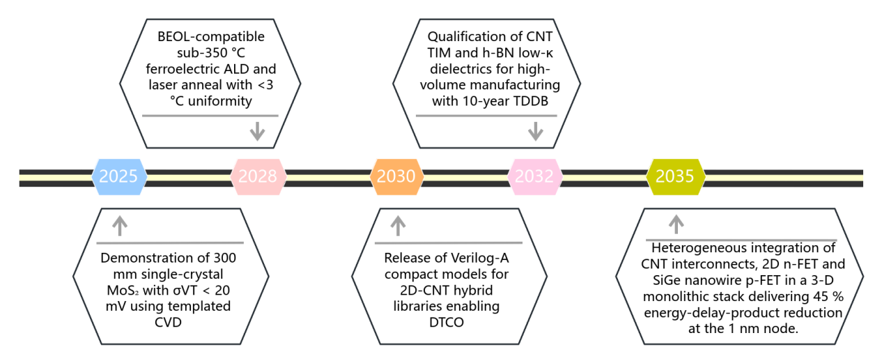 As silicon CMOS approaches the 10 nm gate-length ceiling, short-channel effects, escalating power density and interconnect RC delays erode the traditional performance–power–area dividend. Zero- to two-dimensional nanomaterials—quantum dots, carbon nanotubes, nanowires, graphene and transition-metal dichalcogenides—offer atomically thin channels, ballistic transport and widely tunable band gaps, and are therefore intensively explored to extend Moore’s law beyond pure geometrical scaling. This timely review synthesises experimental and theoretical advances reported from 2020 to 2025, benchmarks key figures-of-merit for logic, memory, interconnect and thermal-management applications, and highlights critical gaps between laboratory demonstrations and 300 mm fab transfer. Sub-1 nm 2D gate-all-around nanoribbon FETs achieving 6 mV dec⁻¹ sub-threshold swing, carbon-nanotube vias sustaining >10¹² A cm⁻² current density and 0.3 V RRAM arrays with 10⁹ endurance cycles exemplify recent breakthroughs, yet wafer-scale uniformity, sub-400 °C BEOL thermal budgets and long-term reliability remain open challenges. A design-technology co-optimisation roadmap targeting the 1 nm node is proposed to guide material scientists, device engineers and EDA developers toward energy-efficient, heterogeneous integrated electronics.