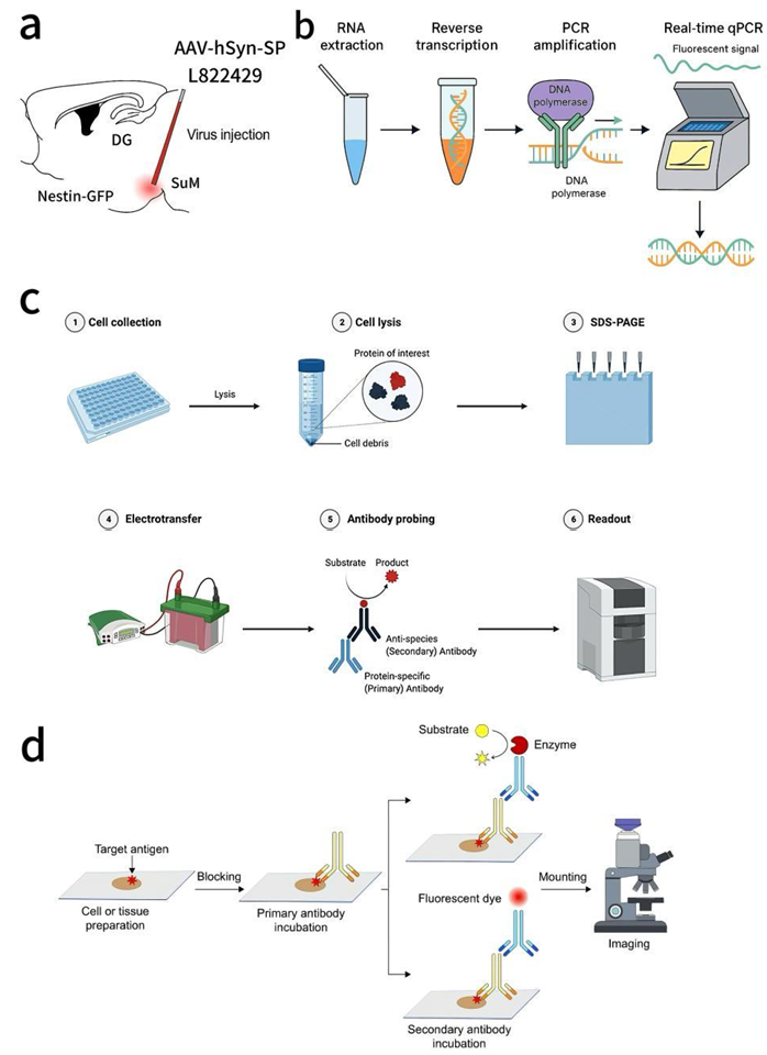 Accumulating evidence showed the adult hippocampal neurogenesis (AHN) has played an essential role in regulating cognitive functions and emotions, while the other potential regulator such as the neuropeptides has still received less attention.. In the nestin-GFP mice, our data showed that the SP-overexpressed SuM neurons inhibited the proliferation of radial neural stem cells (rNSCs) and reduced the cell densities of immature and proliferating neurons in the dentate gyrus (DG). All of these processes were accompanied by depression and anxiety-like behaviours, including the reduced exploration, the lower sucrose preference, and the prolonged immobility. However, the neurokinin-1 receptor (NK1-R) antagonist could reversed those behavioural deficits. Together, our study demonstrated that SP was an essential inhibitor of AHN and emotional behaviours, while the NK1-R antagonism may provide a potential therapeutic strategy for depression and anxiety-like behaviours.