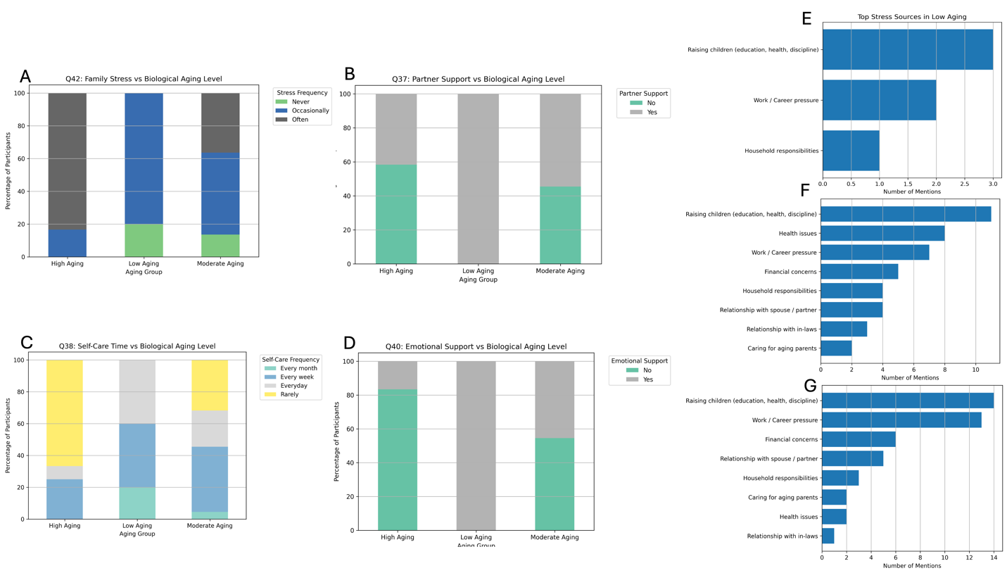 This study explores the psychosocial and lifestyle factors influencing perceived biological aging among middle-aged Chinese women. A total of 39 participants aged 40 and above completed a 46-item questionnaire assessing health status, stress, emotional support, diet, physical activity, and aging perception. Participants were categorized into low, moderate, or high aging groups based on self-reported indicators. Women in the low-aging group reported greater emotional and partner support, lower family-related stress, healthier diets, and more frequent self-care and physical activity. In contrast, high-aging participants experienced greater stress, digestive discomfort, sedentary habits, and exposure to secondhand smoke and alcohol. Interestingly, intermittent fasting was most common in the moderate-aging group. These findings underscore the significant role of psychosocial resilience and modifiable lifestyle behaviors in shaping aging perceptions. The study advocates for holistic, culturally sensitive interventions to support healthy aging in women, particularly those navigating caregiving, career, and health demands during midlife.