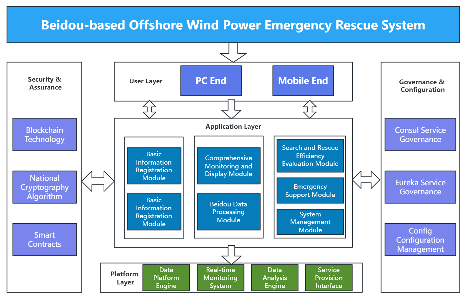 Under the guidance of the carbon peaking and carbon neutrality goals, the global energy structure is being reshaped, and offshore wind power has become an important means for China to promote energy transformation. "Communication lines are lifeline." In response to the high safety risks of offshore operations and the difficulty of ensuring communication for maritime rescue, a marine emergency search and rescue system integrating monitoring, positioning tracking, and emergency rescue based on Beidou has been designed. The system based on the high-quality services of Beidou, has independently developed the marine emergency search and rescue system (software) as well as supporting hardware products such as personal portable beacons, ship-borne beacons, and positioning navigation tracking terminals. It ensures smooth communication and positioning tracking during the search and rescue process, providing solid technical support for offshore operations related to offshore wind power. The marine search and rescue system provides the last line of technical support for the safety of offshore personnel and vessels, enhances the safety awareness of offshore personnel, reduces maritime accidents, and protects people's lives and property.